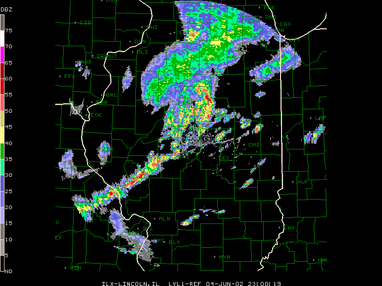 Here is a radar image from 5:00 p.m. as the storm is going severe west of Peoria. A few minutes after this, 2-inch hail was reported near Bartonville, just W of Peoria. Here is a radar image from 6:00 p.m. By now, the line has surged dramatically east and SE, with the most severe part of the storm near the northern end of the bow echo, near El Paso, where .88 inch hail was reported about the time of this radar image.