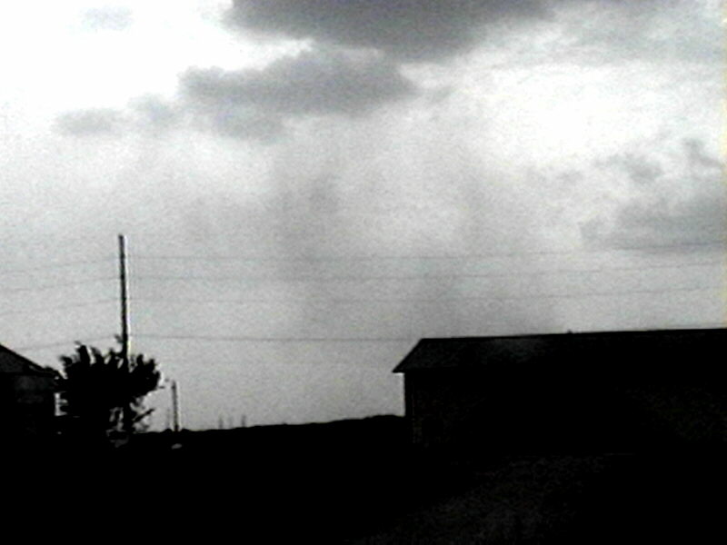 6:50 - Now I see the strong storm ahead, so I exit at Elkhart. I briefly watch a rainbow to my east, then see an odd cloud feature under the updraft of the storm to my SW. It is pretty solid and looks a little like a wall cloud, but it is not attached, and never becomes attached, to the parent cloud above. The part closest to the core is cumuloform and boils up toward the updraft base above, while the part farther away is more stratiform looking. It develops a small inflow band on the side toward the storm, as CG intermittently zaps down in the nearby core. It also seems to gradually widen with time. Occasionally what appears to be hail shafts can be seen in the core near this feature. Here is a picture of this feature.