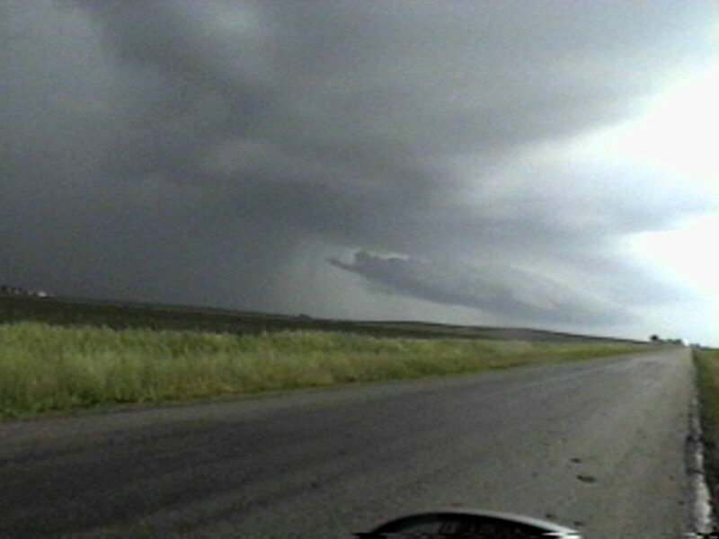 Although I had a commitment at work until early afternoon, this was a day when I knew I could chase after about 1:30 and had been hoping some chase weather would occur. I was not disappointed. This would, in fact, turn out to be a very enjoyable, though non-supercell/non-tornado, chase day, a day in which I would see and videotape what may have been the most spectacular gust front/shelf cloud I have ever seen.