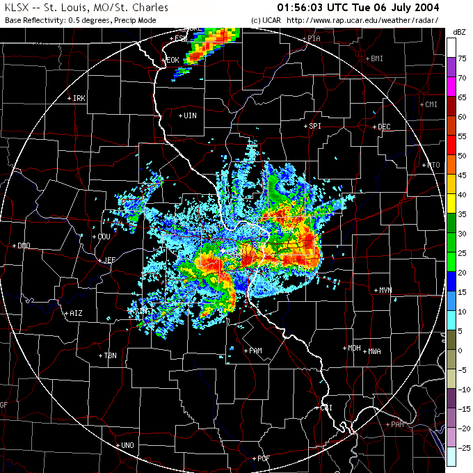What a night - the west St. Louis County area had at least three severe storms move through the same general area. There were widespread wind damage and lots of hail reports from the first two storms. In the first one, Chesterfield had a 70 mph gust and nearby areas had hail to one inch (possibly from a trailing cell along the same line, just to the SW of the leading one). The second storm, which moved through between 9 and 10, produced 3/4 inch hail in Chesterfield and a 92 mph gust across the river at Scott AFB in Illinois. The third storm, moving into west St. Louis County around 11, produced 1.5 inch hail in Chesterfield, blew down large trees in Webster Groves, and resulted (combined with the earlier rain) in people being rescued from cars due to flooding near the Galleria in St. Louis County. Aside from the possible tornado just to the east, Edwardsville missed the worst of it, getting only scattered tree damage (mainly in and near the Willow Creek subdivision) in the first storm, pea-sized hail in the second storm, and nothing from the third one. If all that isn't enough, there were also two severe storms early the morning of July 5, too, and both of them hit parts of St. Charles Co. and west St. Louis Co. So for some parts of west St. Louis Co, that was 5 severe storms in one day!). A total of 155,000 customers lost power on the Missouri side of the St. Louis area, and thousands more in Illinois. Many still did not have power 24 hours later.