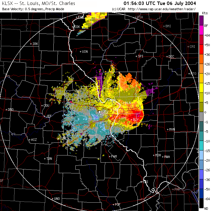 5. Base velocity, 8:56 p.m. - Right near where Bond, Clinton, and Madison Counties meet, there is still evidence of wind blowing in opposite directions. Although it would show up better on a storm-relative velocity image, if you zoom in on the image, you can see a little flow toward the radar site in that location. This suggests that there was at least some rotation in this part of the storm. Note also that, to the south of this feature, everywhere from northern Washington Co., IL all the way back to northern Jefferson Co., MO is experiencing wind motion of at least 36 knots away from the radar site. This produced a very sustained period of heavy winds across the metropolitan area, adding to the widespread damage.