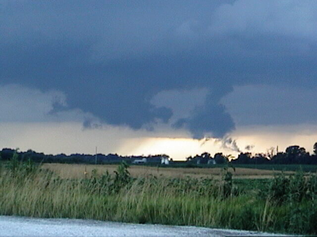 Although I heard various SVR and TOR warnings for areas around Bloomington and to the east, and saw a spectacular backsheared, overshooting storm to my NE, I had decided well before I got to Springfield that I would blast west on I-72 (and angle north from there if necessary) to intercept the tail-end storm I could see off to my northwest. My thinking was that these storms would have the best inflow and would be the least likely to line out, being in an area where no other storms had occurred and good heating had. Also, this was the area progged by the RUC model to have the best instability, and good shear. Finally, I could get to these storms quickest (I thought), since their eastward movement would bring them toward me while the others would move away. By the time I got to I-72 and turned west, I could see the storms were still a ways north of I-72, so I headed north on 4 along the western fringes of Springfield to route 97, which goes WNW, then NNW (more or less) from the NW corner of Springfield. I turned west on route 123, finally getting to where I could see some RFB, but now the terrain turned hilly and wooded. I found a clearing a couple miles east of Tallula and videotaped the very electrified storms for a while beginning around 7:10. What had been the tail-end storm no longer was, as another storm shot up a few miles to the west, a process that kept occurring for the next hour and a half. However, the westernmost storm would usually stay separate from the next one east. Most of the time I was on the second storm from the end of the line, but could also see the next one over. Repeatedly, the westernmost one would drift E or ENE, and another one would fire up where it had been. An example can be seen in this picture showing the knuckled, backsheard anvil of the storm closer to me and (at the lower left of the picture) the top of the glaciating tower of the new storm forming to the west. The storms were very nicely backlit, as it was near sunset and I was near the western end of the line of storms. Around this time, the Lincoln NWS office issued a SVR warning for Mason County based on the storms I was watching.
