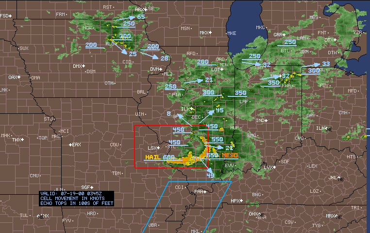 Over the next few hours, the storms gradually evolved into a bow echo, as is shown clearly in this regional radar reflectivity image from 10:45 p.m. (0345Z). Note the very high echo tops - 60,000 feet!