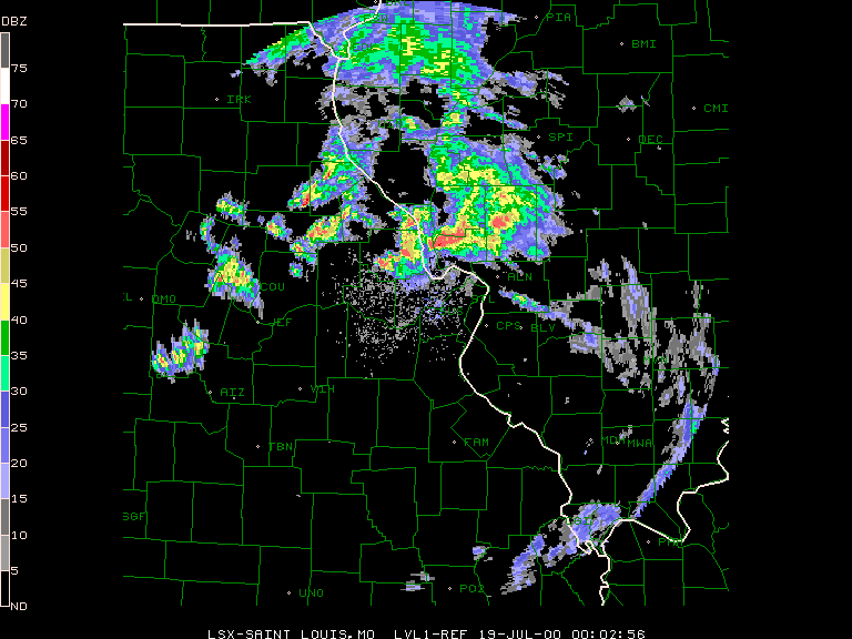 The St. Louis NEXRAD reflectivity image from 7:02 p.m. (0002Z) can be seen here. Note the areas of reduced precipitation on both the SE and SW flanks of the storm in Macoupin Co. These areas show up as blue spots, surrounded by the green and yellow of heavier precipitation. Based on radar reports and our observations, I believe that the area on the SW flank of the storm is the meso. This image is from about the time we observed the lowering, and 12 minutes after the reported time of the tornado.