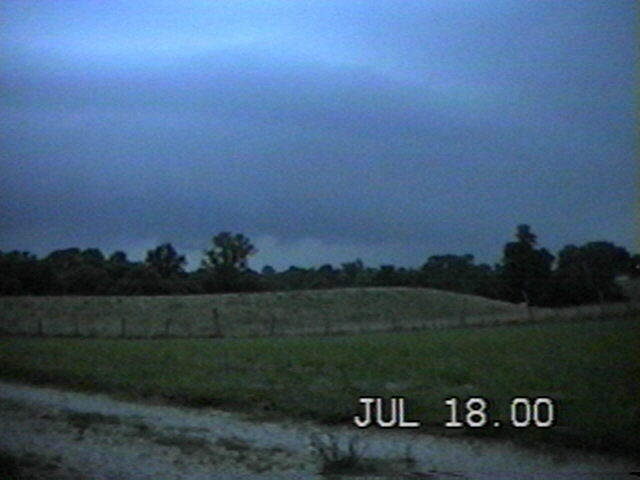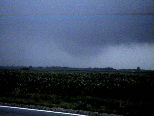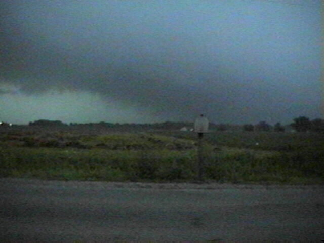 7:00 - We view what appears to be a rain-wrapped meso just east of Shipman, to our NW. Striations are evident above the scuddy updraft base. There is a very dark area under one part of it, but rain hides it so we can't see what it is. I realize we are going right into intense wrapping precipitation if we go any farther west and see a small parking lot near a utility property on the right of the road, slightly elevated. After blowing by, I turn around and return to it. Here I videotape the base and striations - again it has the look of a rain-wrapped meso but I can't see what is inside, in part because although the spot is high, trees are blocking the view in the direction of the center of the meso. Partly for this reason and partly because it is bearing down on us, I leave and move slightly east. After moving and getting clear of trees, we see large bulbous, partly rain-wrapped lowering. [ NOTE: Due to the poor contrast and wrapping rain, the contrast on this video capture has been enhanced. That is the only way in which it has been altered.] Although we had not heard the tornado report at the time, this - and the dark area we had seen minutes earlier - was almost certainly the remains of a tornado that was reported by police at 6:50 south of Medora, about 5 miles west of our location. The tornado touched down briefly in open country and dissipated, doing no damage. Again we were approached by intense precipitation wrapping around the south side of the meso - perhaps from a wet RFD, or from the next storm down the line, or a combination of the two. The whole thing was very HP-ish, with poor contrast and lots of wrapping rain. In order to avoid getting swamped by this oncoming precip, we moved back east to the intersection of 16 and 159. Somewhere en route I looked at my watch and saw that it was 7:05.