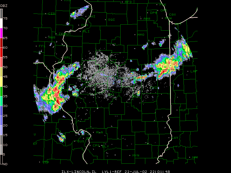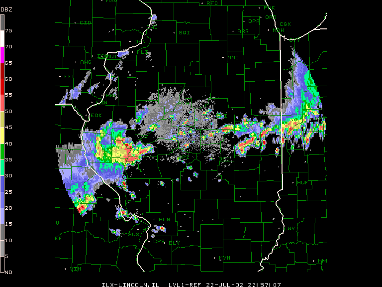 5:50 - In rapid-fire succession, SVR warnings are issued for NE Pike Co., then for Scott and Morgan Counties, then for Cass County, all for svr storms indicated by radar NW of Winchester and W of Jacksonville. Here is a radar image from just before 6 p.m. showing the storms just northwest of Winchester and Jacksonville.
