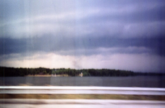 Around 7:15 - I stop for 10 minutes or so at the Carlinville exit to photograph and videotape the approaching gust front. As it nears, a precip core intensifies rapidly just to my west, and I decide to drop south to avoid it. Shortly after 7:30, though I cannot avoid the next one as it crosses I-55 just south of Litchfield, and I am in blinding horizontal rain for about 5-10 miles - near zero vis at times.