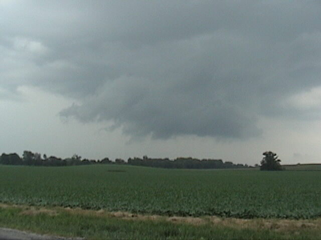I managed to get on two severe storms, the first one being the storm that prompted the SVR warning for St. Clair Co. It had a large but non-rotating wall cloud which was located just east or southeast of Lebanon, IL. This lowering was directly under the main updraft of this storm. I watched this storm for about 15 minutes, until gradually the wall cloud became detached from the base of the parent storm cloud as the storm began to be seeded by another storm to its west over Belleville. So I broke off and cut south to get ahead of this storm, which also went SVR-warned at 6:45 p.m. I got in good view of this storm south and southwest of Mascoutah, IL, as it produced a roll cloud and later a lowering of some kind under the gust front southwest of Mascoutah. Both storms produced lots of CG, with the first one dropping nickle-sized hail and producing a 60 mph gust in Germantown and the second producing dime to half-dollar hail in much of the Belleville area into Fairview Heights. Got some decent structure pics and a couple nice vid caps of CG lightning, including this one of a CG bolt under the lowering on the front of the storm. Not a bad chase for not leaving until 6 and home by a few minutes after 8!