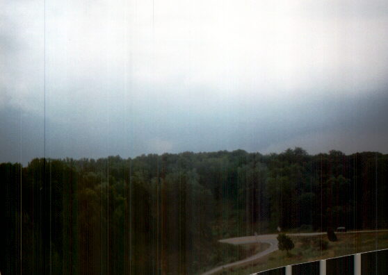 We decided to cross the river and park at the Illinois welcome center, which is on a high overlook facing west at the top of the bluffs. One storm passed north of us, displaying a wall cloud at times but no funnels or rotation that we could see. Two more came behind it, one to the northwest with what first looked like a large wall cloud but may have been scud as it became totally detached from the parent cloud. To the southwest was an intensifying precipitation core with lots of outflow clouds, which spread over us with strong outflow gusts.