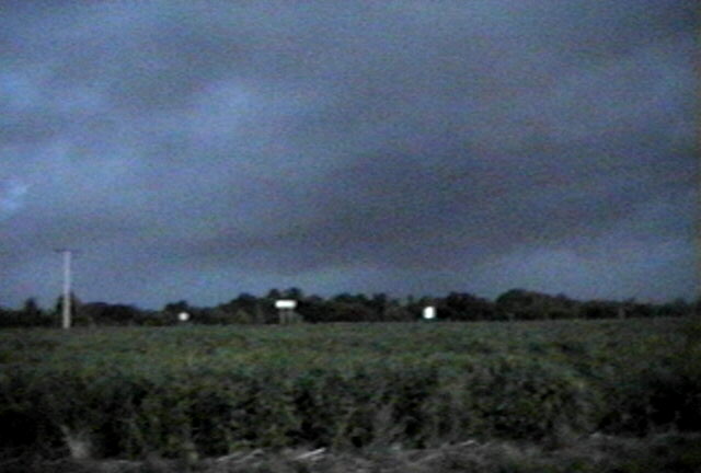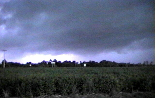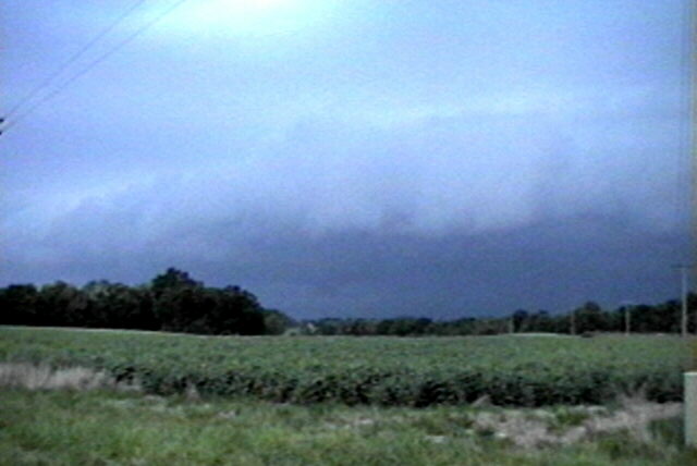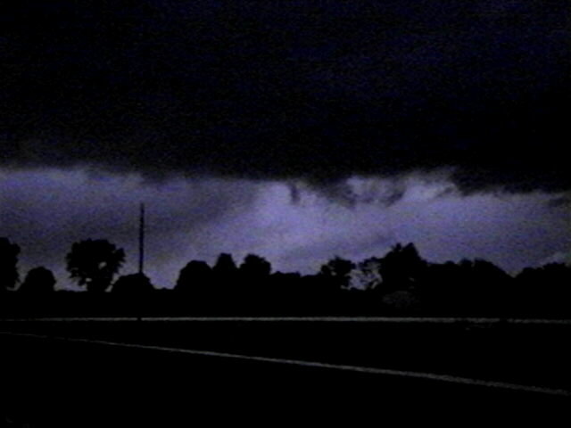 6:50 - Just ahead of storm at E. edge of Winchester. (Wind damage occurs in Hannibal about this time, about 40 MI W or WNW of my location.) I watch an impressive shelf cloud gradually approach from N. (This and all other images in this report are video snaps.) I videotape the shelf cloud and lighting. A particularly heavy cell is to my NE, probably not far from Jacksonville. Here is a view in this direction, and here is the same view with lightning. The leading edge of the wide, roiling shelf cloud moves over me. It becomes very dark. I watch the storm for about 20 minutes until I am overtaken by heavy rain and 35-40 mph wind from NW.