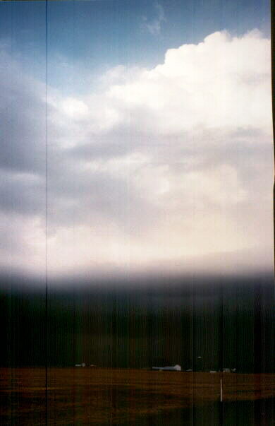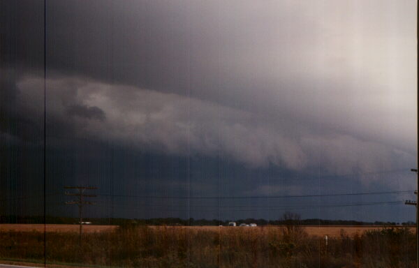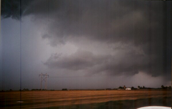 Around 4:00 - 4:30 - I exited I-55 at Chenoa, headed a little north on old Route 66, and parked and set up tripod on the closed side of old Route 66 just north of Chenoa as the tail-end storm approached. To the N and NE was a Shelf cloud, some lightning, and heavy rain. To the W and NW was a ragged updraft base with brief lowerings. This apparent inflow structure was one of the more interesting. After 20-30 minutes this part of the line went outflow-dominant, as new storms were forming farther west. I left, passed by a spotter/chaser just S. of where I had been, and worked my way west on U.S. 24 to U.S. 51, then worked my way northwest of El Paso on back roads.