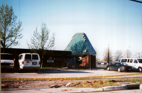 Next door east to the Moose lodge is a Kinder Care day care center. It suffered roof damage, and its school bell tower was lifted off the entry roof, landing in the parking lot. In this photo it can be seen on the ground just left of the entrance if you look closely. Several of the vans lost windows due to wind or flying debris. Note the police lines; the day care was closed the day after the tornado.