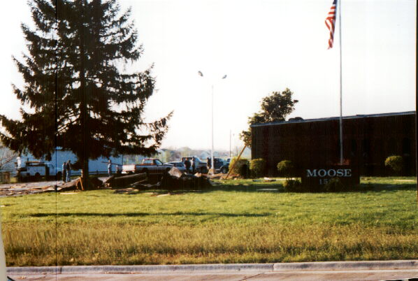 A little farther east, most of the roof of the Edwardsville Moose lodge was blown off. In this photo, much of the roof is seen on the lawn. A good bit of it also ended up in the parking lot. Seven air conditioning units at the Moose lodge were also destroyed.