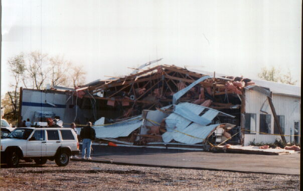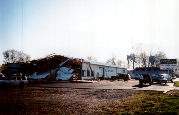 Just to the east, the west half of the roof of an auto body shop was lifted off and much of it ended up in trees east of the building. Here is a photo of the damage to both of these buildings.