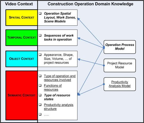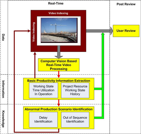 My dissertation involved the development of video intelligence models for automated productivity analysis of construction activities. Gathering data for improving on-site operations is an essential and difficult task in construction. Among other things, video taping has long been used in construction to analyze construction operations. And recently, construction webcams have been increasingly used in construction projects for jobsite monitoring, providing live streams of visual information on ongoing construction activities. However, in the absence of an efficient video interpretation method, tedious manual reviewing is currently still required to extract productivity information from those videos. My research investigates intelligent computing methods for automated construction video analysis. The core of this research is to develop a generic computer-based video interpretation model that can interpret the live streams of visual information about ongoing construction activities and extract productivity information automatically at the level of human intelligence. The success of this research can greatly facilitate productivity data collection and real-time construction operation state intelligence. As a proof of concept, I have developed a model-based system that combines techniques from the areas of construction process modeling and simulation, construction productivity analysis, computer vision, and pattern recognition. The results demonstrated the feasibility and effectiveness of the proposed approach.