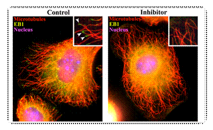 control samples EB1 binds to the plus-ends of microtubules (inset, arrows). Right: In the presence of a known