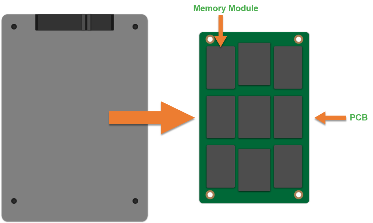 Inside the solid-state drive, you will find a PCB (Printed Circuit Board) with either Flash or DRAM (Dynamic Random Access Memory) memory modules soldered onto the PCB. Data is read and written digitally to the solid-state drive, or memory module; which is where the data is stored. Traces, or paths, on the PCB which carry the data to and from the memory modules.