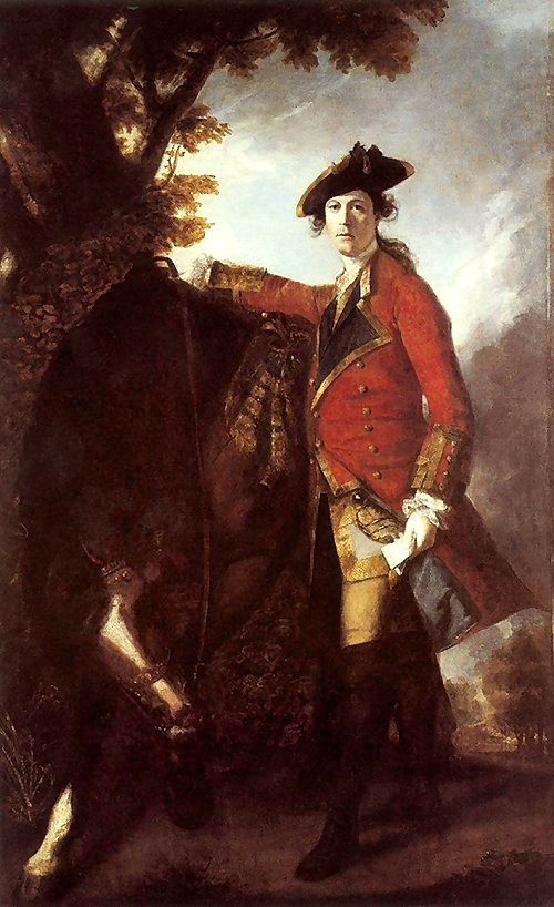 Note the composition of this portrait: the figure of Captain Orme is vertical and erect; most other elements in this portrait (horse, clouds, even the tree) depart from the vertical, thus helping the figure of Orme dominate the portrait. This domination is enhanced dramatically by Reynolds' use of color: except for the sky (more on that in a moment), everything around and behind Orme is dark and muted, allowing the scarlet and gold of his military uniform to stand out all the more.