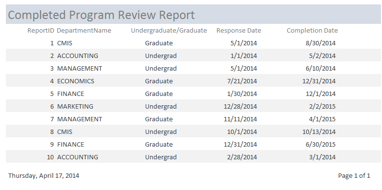 Description: This access database was created for Dr. Kobb, so she can input information about the current or past Chair, Dean, Director, Internal Review, External Review, and Self Study Preparer. The database makes her job a lot easier because she can easily pull up information about any of these undergraduate and graduate program documents, from any point and time. The database also allows her to send out emails to whomever she needs by clicking one button and choosing the recipients. Automated emails are also available, in order to keep employees informed on their due dates. Lastly data can be added or updated at any point in time.
