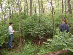 The SIUE Campus features perhaps 1000 acres of old field and degraded forest habitat. The region was colonized fairly early in the 19th Century (St. Louis, MO is 20 miles away), and with this much of the local forest has been high-graded or otherwise mismanaged. In a pilot study, the Schulz lab, in conjunction with faculty Dick Brugam and Bill Retzlaf are attempting to replant the extirpated oak-hickory forest that dominated the region. We call this the 200 Pound Squirrel Project because of its decidedly offbeat approach. Guess which one of us best fits the appellation "200 Pound Squirrel!"