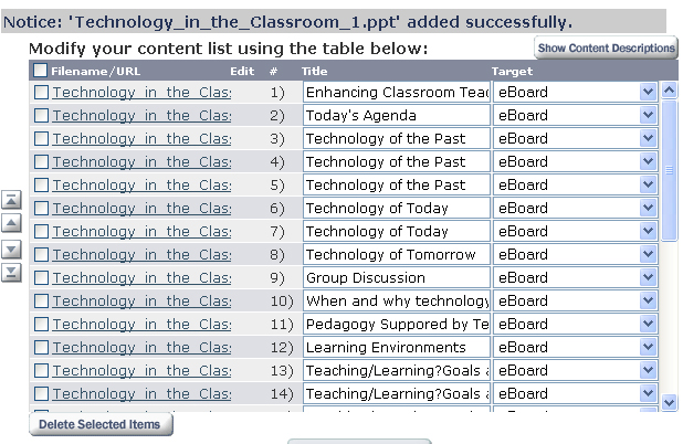 To delete an image, click the check box to the left of the image to be deleted. Click the Delete Selected Items button at the bottom of the window. Note: once a slide is deleted, it can not be retrieved without upload it again from the PowerPoint presentation.