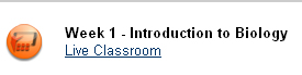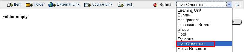 | From your Content Area, click on the down arrow for the "Select" box, and click on Live Classroom. Click the Go button to continue. |