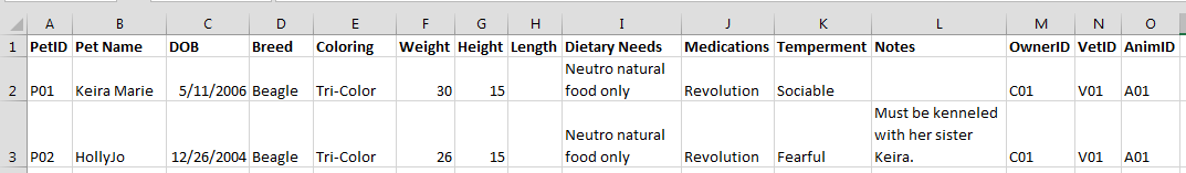 it is unique for each record, is not empty for any record and shouldn’t need changed for any reason in the future. The last three columns: OwnerID, VetID and AnimID are foreign keys. While they contain data that looks like a potential primary key they do not satisfy the three primary key criteria for this worksheet.