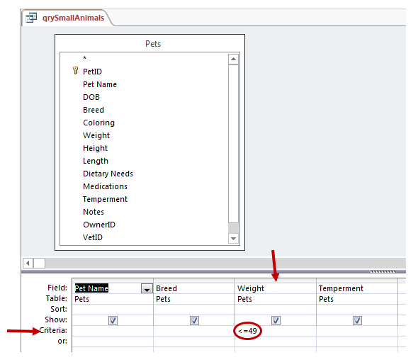 Criteria is placed on the ‘Criteria’ row at the bottom of the design grid in the column for the appropriate field, as shown in the image below. The image contains the ‘qrySmallAnimals’ design view. The arrow pointing to the right identifies the criteria row. The arrow pointing down identifies the field on which the criteria is place, in this case, Weight. The circle contains the actual criteria: <=49. So, in this case, the Menagerie Kennel considers Small Animals to be those that weigh 49 pounds or less. (The definition of small animals was obtained by looking at the data in the Services table.)