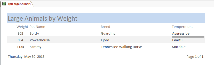 Sorting arranges records in ascending or descending order depending on your choice. The image below shows the Large Animals report sorted ascending (smallest to largest) on the Weight field.