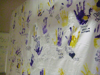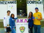 “These Hands Don’t Hurt” is a national service project that Alpha Kappa Lambda created to promote the fight against domestic violence in all its forms (spousal, sibling-sibling, parent-child, roommate-roommate.) During the promotion, the Men put together what is called a “Hands” Wall. Basically, students and other spectators make pledge against domestic violence by painting their hand and imprinting it on the Wall; or at other chapters, students cut out a piece of paper in the shape of their hand and paste it onto the Wall. The students/spectators then sign the Wall or Hand. By doing so, that student has made a pledge against domestic violence. You can learn more by visiting the National Website.