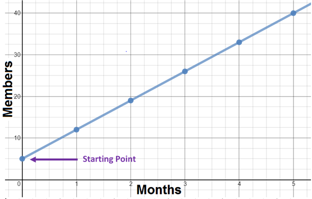 each month! What is the starting point? - Ask yourself, "How many members did I begin with?" - If you said, 5 members, you are correct! How was your graph? - Did you label your axes with Members and Months? - Did you point out your starting point on the graph? |