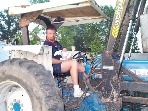 Daddy let me sit on his lap while he worked with the tractor at the park.