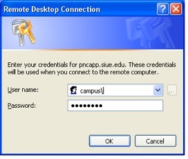 If you do not see this window after double clicking ‘PNC Desktop’, skip to Step 3. If you do see this window, enter your e-id credentials, as shown above, being sure to prepend your user name with ‘campus\’. For example;