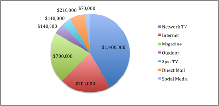 Our Advertising budget will be split between five mediums, Net TV, Spot TV, Internet, Outdoor, and Magazines, as well as direct mail and social media. According to studies, our target audience spends most of their time watching television compared to reading magazines or surfing the Internet. Because of these statistics, our consumers will be most affected by television advertisements. We will put 40% of our ads on network television since that is the most viewed medium. We will then put 20% of our ads on the Internet and in magazines for our audience to see, and 6% towards direct mail. Then we will take 8% of the remaining money for ads and put it towards outdoor and spot TV advertisements, and the other 2% towards social media efforts. By doing this, we will be able to increase sales over 15% and increase profits to over 40 million.