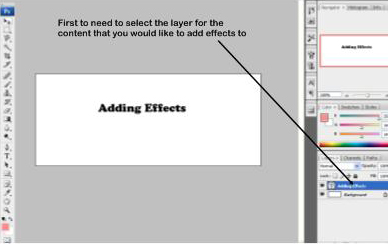 There is a button in the layers menu that allows you to add specific effects to your content. The button is label "fx". By clicking the fx button you will get a prompt with the various effects available in Photoshop.
