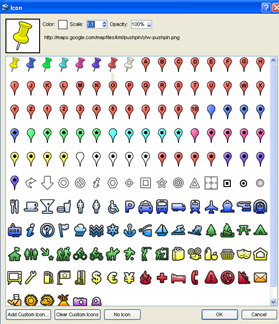 One fun little thing that is available is setting the icon that you would like displayed with your placemarker. If you are marking specific items, such as an airport, it might be handy to use an airplane icon. You can get to this menu by clicking to the right of the title in the properties prompt (previous photo).